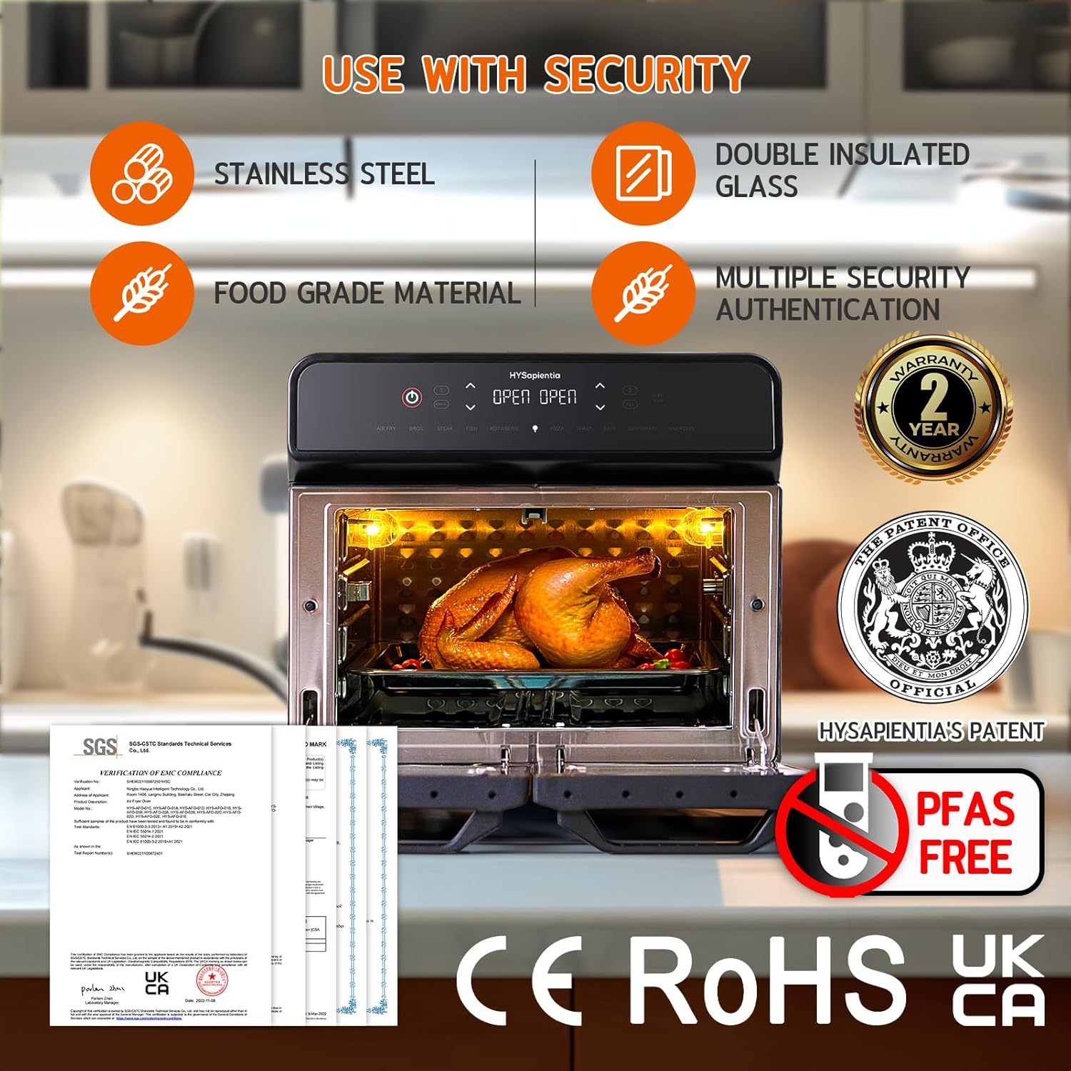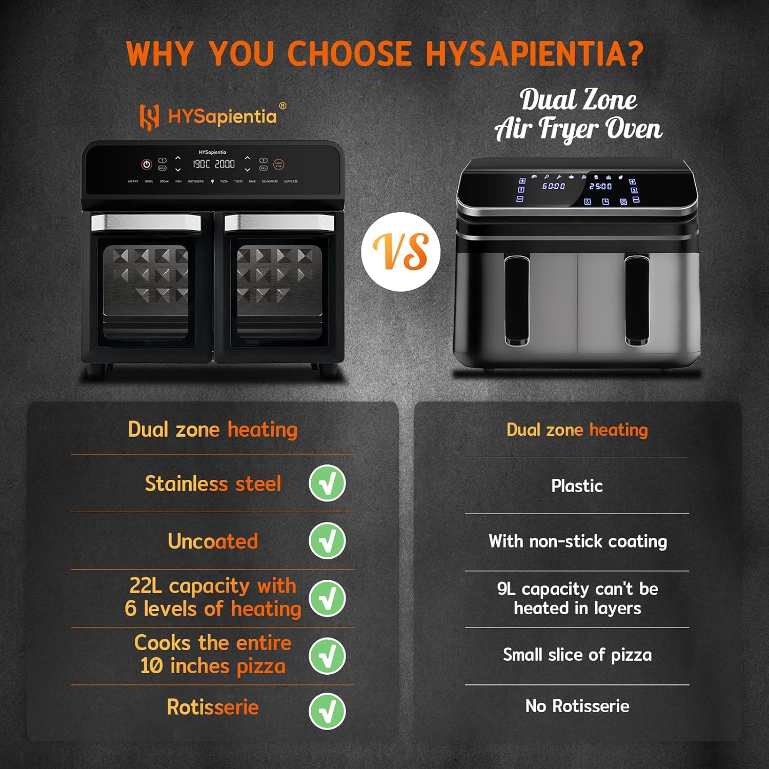 HYSapientia 22L Dual Zone Air Fryer Oven | Stainless Steel Interior | 10 Preset Modes | Rotisserie | 360° Rapid Heat | Family Size Smart Cooking